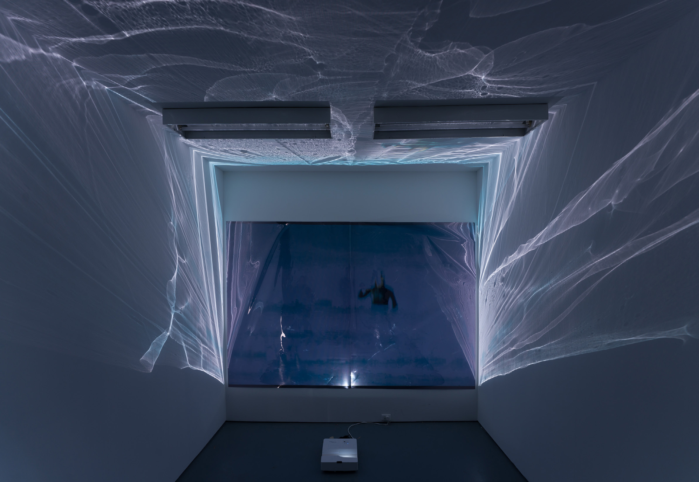 In the installation, Spin into Being wraps viewers in light, with reflected tessellations enveloping them on ceiling, walls and the floor. The encompassing, ebbing pulse of kaleidoscopic water is furthered by the rhythmic gesture of collecting and dispersing water in the video piece. This translates to the physical motion of spinning that produces the photographic images. The centrifugal thus becomes dually generative.
